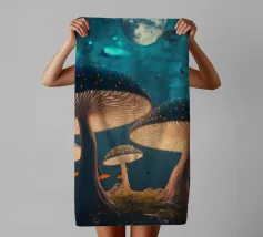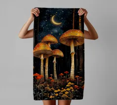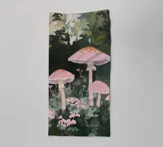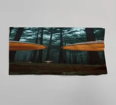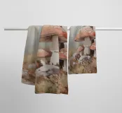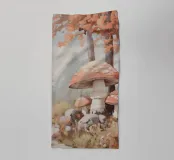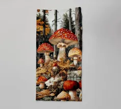 Peaceful forest scene featuring tall trees with vibrant autumn leaves, large red mushrooms with white spots surrounded by grass and rocks, and a misty atmosphere with distant coniferous trees.