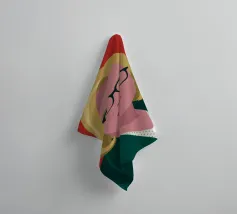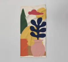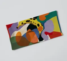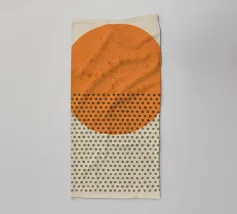 A modern abstract composition of geometric shapes and color blocks in a palette of yellow, black, pink, and orange. The style is balanced and has a retro feel.
