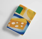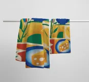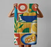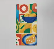 A modern, geometric still life featuring a bowl of citrus fruits and a piece of cheese, arranged in a bold, color blocked composition. The clean lines and vibrant colors give a contemporary twist to a classic subject.