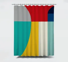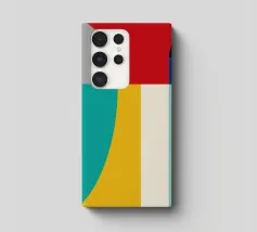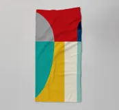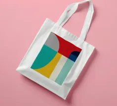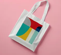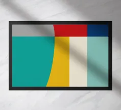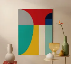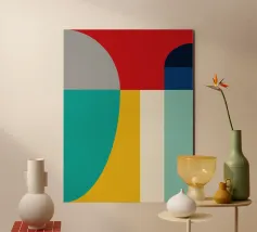 A bold arrangement of geometric shapes and vibrant colors creates a striking abstract design. Different shapes are juxtaposed to form an eye-catching pattern.
