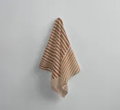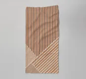 Striking geometric design featuring white parallel lines arranged in various orientations, creating triangular and trapezoidal shapes against a brown background, resembling a wooden texture.