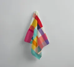 A geometric composition features a grid of colorful rectangles and squares interspersed with shades of gray, creating a modern and abstract pattern. The arrangement of different colors and gradients gives the piece a rhythmic visual flow.