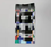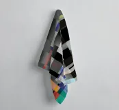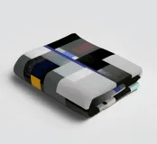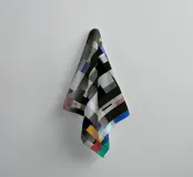 A geometric arrangement of colored rectangles and squares creates a vibrant abstract pattern. The design utilizes a grayscale background with pops of orange, blue, and green, creating a visually dynamic composition.