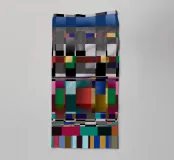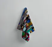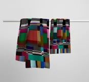 An abstract composition features a series of geometric shapes and bold, vibrant colors arranged in a grid pattern. Distinctive blocks of color are interspersed with linear elements, creating a visually dynamic and modern design.