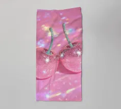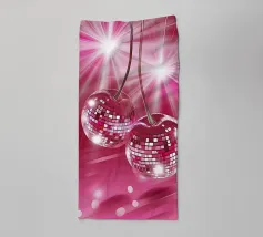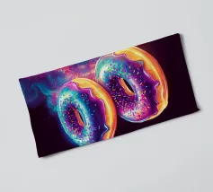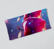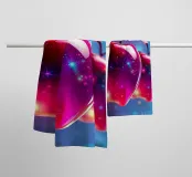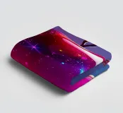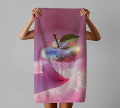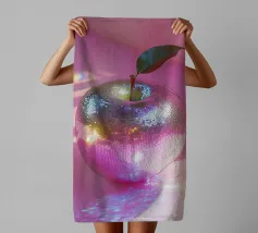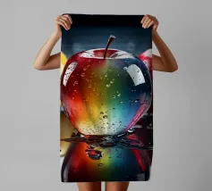Glossy apples with a vibrant cosmic design float against a colorful background filled with sparkling lights.