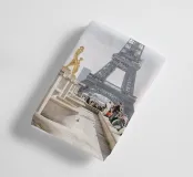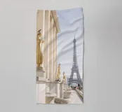 The Eiffel Tower and golden statues in Paris seen from Trocadero