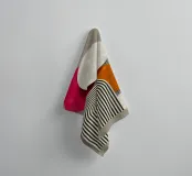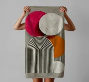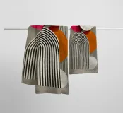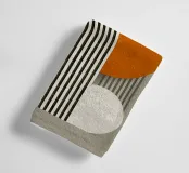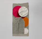 This abstract Bauhaus inspiration combines geometry and symmetry in a modern design. With white circles, semi-circles and stripes in grey, orange and pink, the illustration creates a harmonious interplay of colours. The retro striped architectural shapes give the artwork a minimalist and structured aesthetic.
