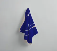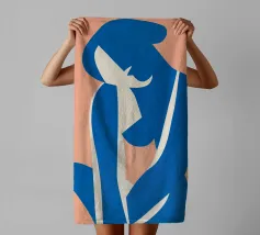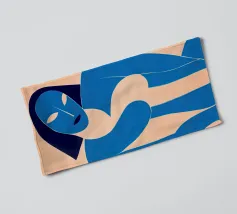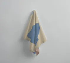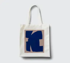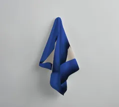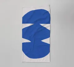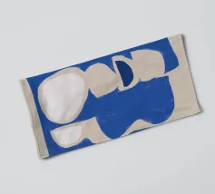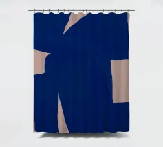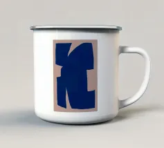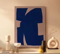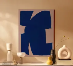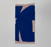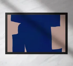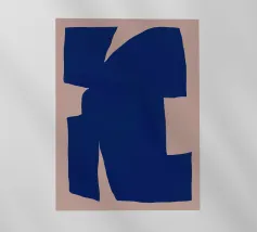A bold blue abstract shape dominates the center of a textured pink background. The shape has no clear form, suggesting a spontaneous or unplanned design.