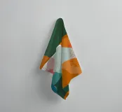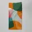 An abstract artwork features multiple layers of color and texture, with torn paper effects and dotted patterns in a palette of green, terracotta, and orange, creating depth and tactile interest.