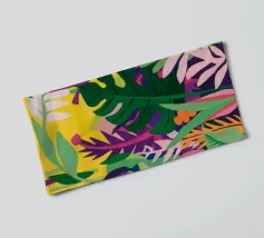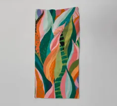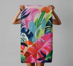 Elongated tropical leaves flow upward through a gentle pink glow, creating a secret vertical garden.