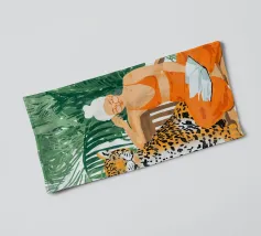 This artwork captures a person in a black dress striking a poised pose beside a leopard. The scene exudes sophistication, confidence, and timeless artistry.