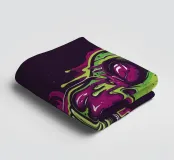 A vibrant and surreal digital illustration of an alien-like skull merging into a dripping light bulb, featuring neon green and magenta colors against a dark purple background. The eerie, dripping design combines horror and sci-fi aesthetics.