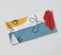 A continuous line drawing creates an abstract face with red lips and a star, overlapping with a sun shape on a textured background, blending minimalism and surrealism.