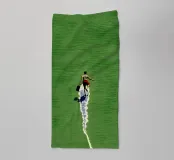 A single figure walks barefoot across a huge green surface - but its track is made of glistening water. The narrow path of water runs through the picture like a crack in everyday life, allowing reality and surrealism to flow into one another. With a determined stride, the figure embodies freedom, unusualness and the art of finding one's own way.