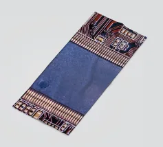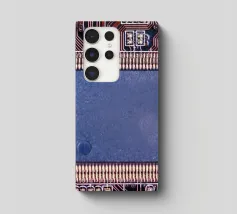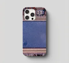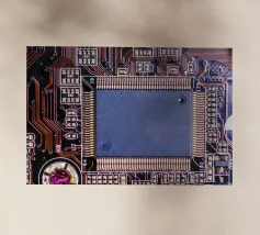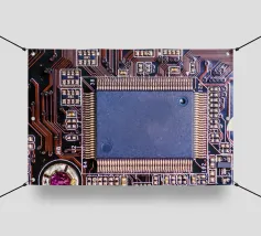 This technical macro image shows a microprocessor embedded in a highly complex circuit board with numerous electronic components. In the centre is the square processor housing, whose fine pins are precisely connected to the circuit board below. Copper tracks run systematically across the entire surface and connect various components such as resistors, capacitors and IC elements. Particularly noteworthy are the rectangular resistors labelled "330", which appear in carefully arranged groups.