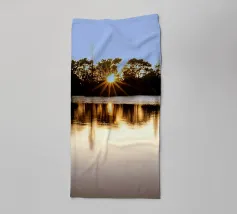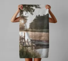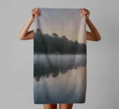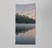 Gentle fog blankets the still surface of a serene lake as sun rays begin to illuminate the landscape, highlighting the surrounding trees at dawn.