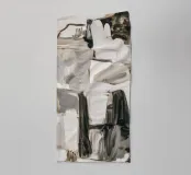 A stark abstract piece with bold black and white structural forms, possibly suggesting a divided landscape or architectural elements, with a strong sense of balance and contrast. Bob Nugent style.