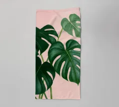 A close up illustration focusing on the iconic, fenestrated leaves of a monstera plant against a pale pink background. The composition is a simple, elegant, and minimalist study of a beloved natural form.