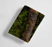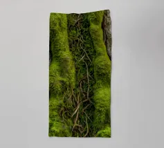 The bark of a large tree is adorned with vibrant green moss, intertwined with twisting branches, reflecting the tranquil ambiance of a forest in the early morning light.