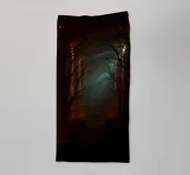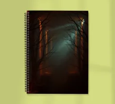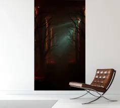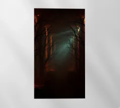 A dark forest with bare trees creates an eerie atmosphere, while soft fog intertwines with glowing lights, providing an abstract and captivating wallpaper design for mobile devices.