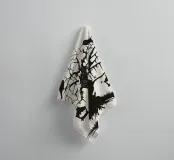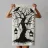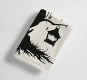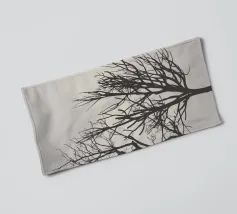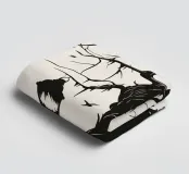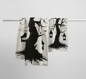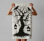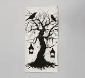 This silhouette illustration shows a weathered, gnarled tree with hanging threads of moss on which several ravens are perched. Two lanterns hang down from the branches, while bats fly in the background. The design conveys a mysterious, slightly gloomy atmosphere reminiscent of old legends or fantasy worlds. Ideal for fans of gothic style, fairytale aesthetics or Halloween decorations. The minimalist contrast between the black and light-coloured background enhances the dramatic effect.