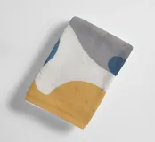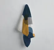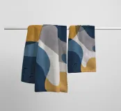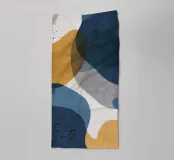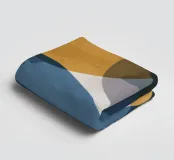 Bold blue and ochre shapes overlap in rhythmic flowing tension.