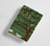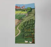 A rolling landscape of green and golden patchwork fields is seen from a high vantage point, with a lone tree and a distant farmhouse, celebrating the beauty of agriculture.
