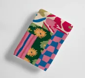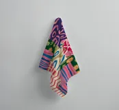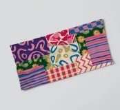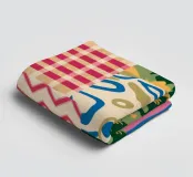 An abstract pattern combines patchwork-like color blocks with energetic scribbles and stripes, creating a dynamic, playful, and artistic design.