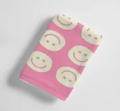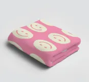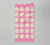 A playful pattern of cream-colored smiley and frowny faces arranged in rows on a pink background.