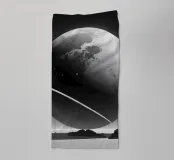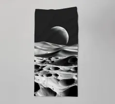 A large planet adorned with rings floats above a barren terrain, while distant celestial bodies illuminate the starry sky. Shadows of mountains add depth to the surreal setting.