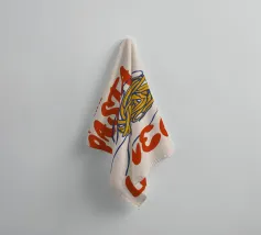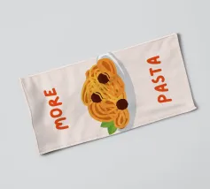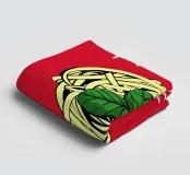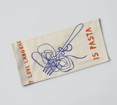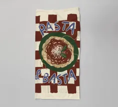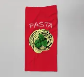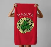 Tagliatelle on a red background with basil leaves and the word 'Pasta'