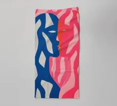 An abstract composition features bold, primary-colored shapes blue, red, and yellow interacting to form a deconstructed, surreal face or figure.