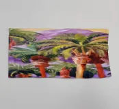 A grove of palm trees is depicted in an abstract, prismatic style, with vertical stripes of vibrant, illuminated color purples, pinks, and yellows creating a highly energetic and modern tropical scene.