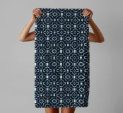 A repeating geometric pattern features intricate, symmetrical shapes in a dark color scheme. The design is consistent and evenly distributed, creating a seamless visual effect.