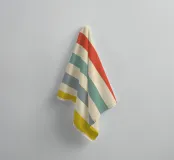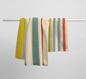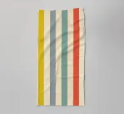 A timeless retro summer stripe pattern featuring muted shades of blue, red, yellow, and teal on a soft ivory background, enhanced with subtle texture for a warm, classic feel. Effortlessly stylish, this versatile design is perfect for home decor, accessories, stationery, and more