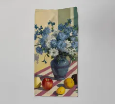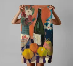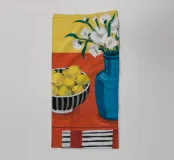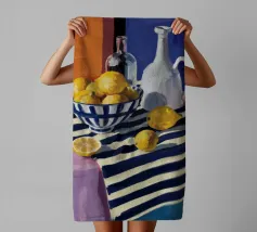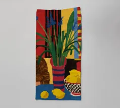 An inviting still life on a bright red table, featuring a bowl of lemons and a blue vase holding delicate white flowers. The warm yellow background enhances the cozy and vibrant atmosphere.