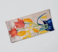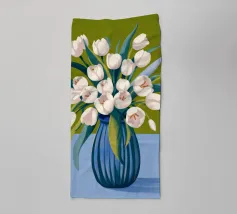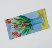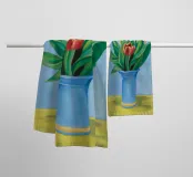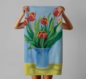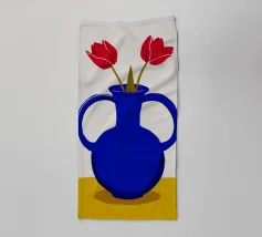 A classic still life painting of vibrant red tulips standing tall in a light blue cylindrical vase, placed on a yellow table against a complementary blue background.