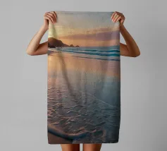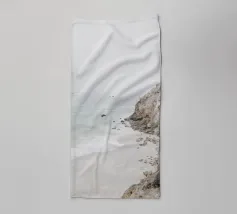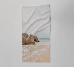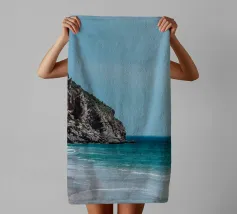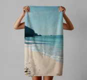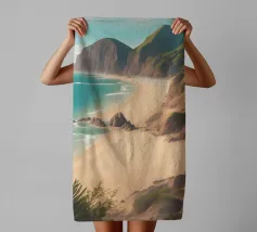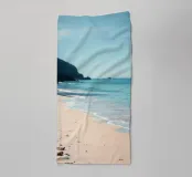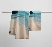 A tranquil beach stretches along the coast, with gentle waves rolling in under a clear blue sky. The soft sand is untouched, inviting visitors to relax and enjoy nature.
