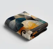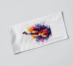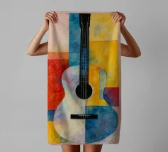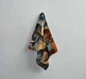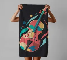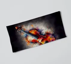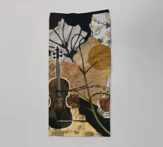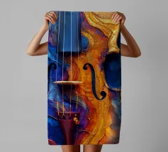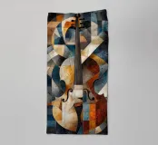 A striking abstract artwork depicting a violin in a cubist style, featuring overlapping geometric shapes and a rich color palette of earthy tones, blues, and golds. The composition emphasizes texture, depth, and movement.