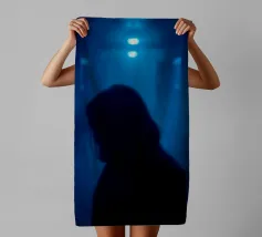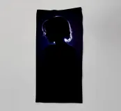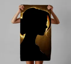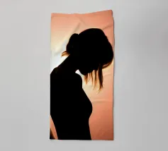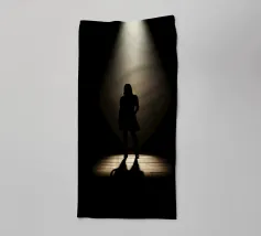 silhouette stands in front of a dark backdrop, illuminated by a gentle light source from behind, creating a soft glow around the hair. The atmosphere is calm