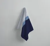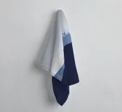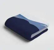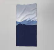 Layers of hills or mountains in various shades of blue create a sense of depth, leading up to a large, snow-capped peak in the background. The style is minimalist and uses a gradient of colors to convey the landscape's silhouette against a light sky.