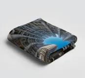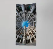 A striking circular architectural design featuring concentric rows of tall columns and interconnected buildings. The fisheye perspective emphasizes the geometric symmetry and opens up to a clear blue sky, creating an awe-inspiring and immersive urban scene.