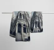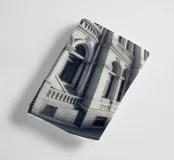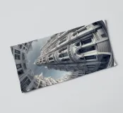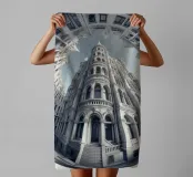 A captivating fisheye lens view of a neo-classical style building surrounded by ornate structures in an urban courtyard. The distorted perspective emphasizes intricate details, symmetry, and the architectural grandeur of the scene.