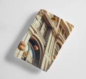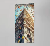 A whimsical depiction of a historic building with intricate details surrounded by a vibrant sky filled with floating fruits and vegetables. The surreal composition blends architecture and fantasy for a creative, colorful visual.