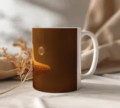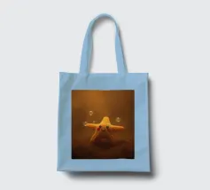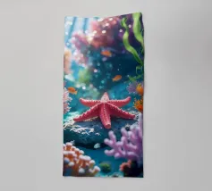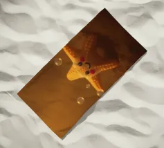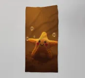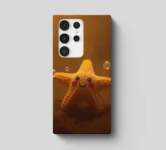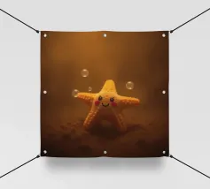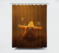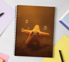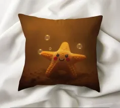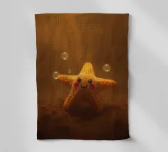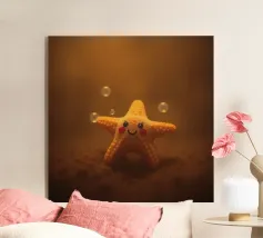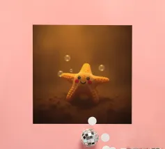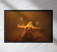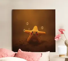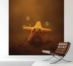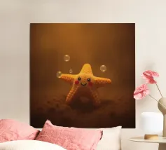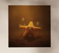 A cheerful starfish sits on a sandy ocean floor, surrounded by small bubbles. The soft glow of warm light creates a serene atmosphere in the underwater scene.