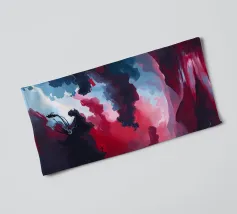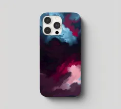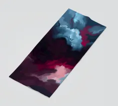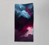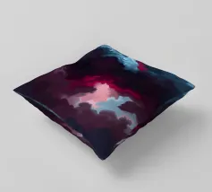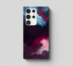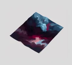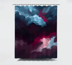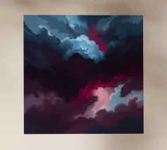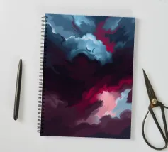 Dark and light clouds intertwine in stunning hues of blue, red, and gray as dusk approaches. The swirling patterns evoke a sense of movement in the evening sky.