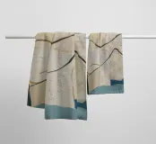 This painting features an abstract composition with flowing lines and shapes, using a muted color palette of beige, brown, and blue. The artwork is subtle and elegant, creating a sense of harmony and balance.
