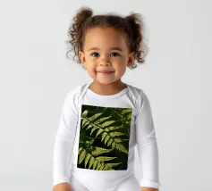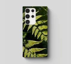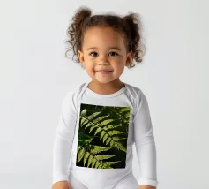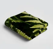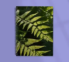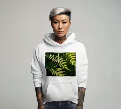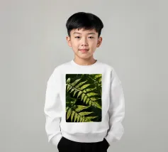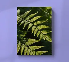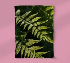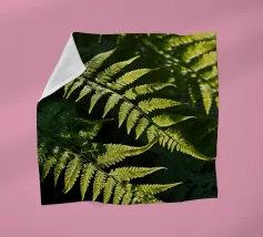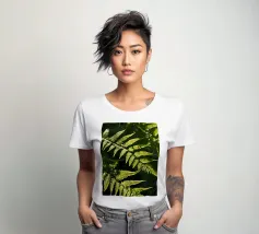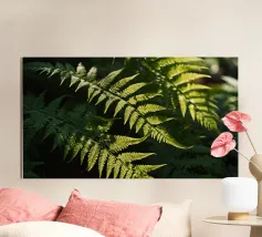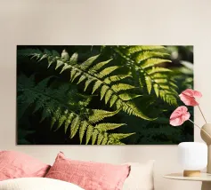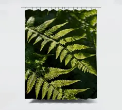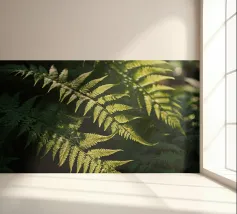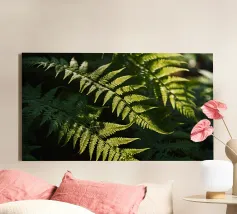 Sunlight streams through the dense canopy, illuminating vibrant green ferns that create a peaceful atmosphere in the forest. Their delicate, detailed leaves reflect nature's beauty.