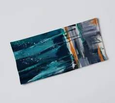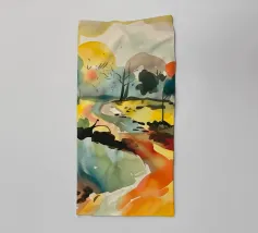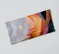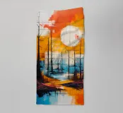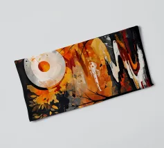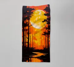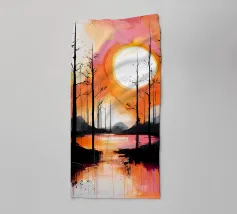 A vibrant and abstract painting capturing the essence of a serene sunset. Bold strokes of orange and blue create a dynamic contrast, while the silhouetted trees and a large, luminous moon add depth and mystery to the scene. This piece is perfect for contemporary spaces seeking a touch of nature and tranquility.