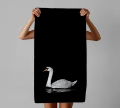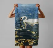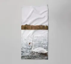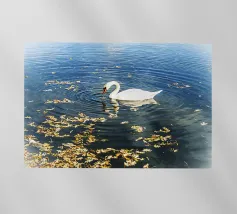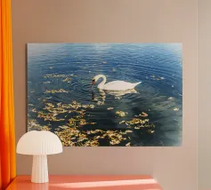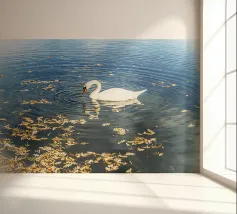 A serene scene on a calm blue lake, featuring a swan lifting its head from the water, creating gentle concentric ripples. Yellow autumn leaves float nearby, adding subtle color. Perfect as a wall art print for living rooms, bedrooms, offices, or nature-inspired spaces.